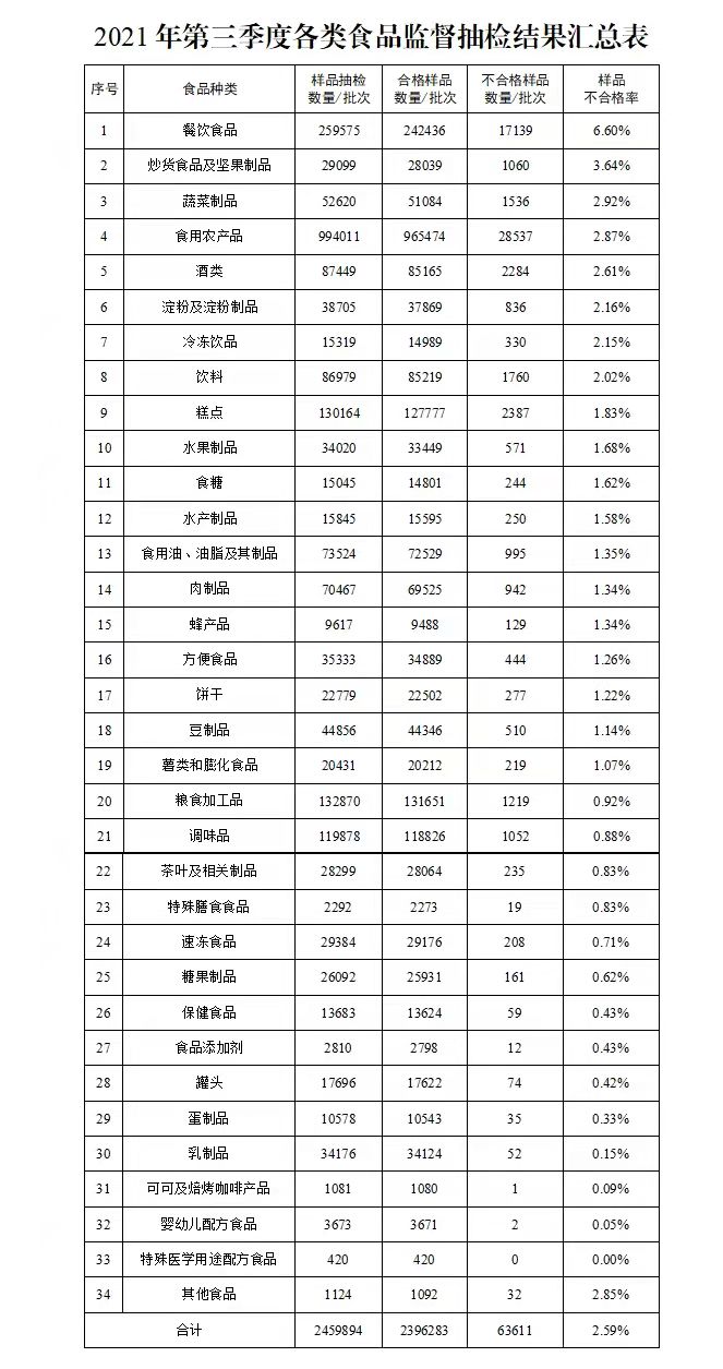 2021年11月17日18:54 | 来源:人民网 人民网北京11月17日电 (记者李楠桦)据市场监管总局消息,市场监管总局近日公布第三季度食品安全抽检情况。数据显示,2021年第三季度,全国市场监管部门完成食品安全监督抽检2459894批次,依据有关食品安全国家标准等检验,检出不合格样品63611批次,总体不合格率为2.59%,较2020年同期上升0.37个百分点。 从抽样食品品种来看,消费量大的粮食加工品,食用油、油脂及其制品,肉制品,蛋制品,乳制品,监督抽检不合格率分别为0.92%、1.35%、1.34%、0.33%、0.15%,均低于总体不合格率。与2020年同期相比,茶叶及相关制品,冷冻饮品,食用油、油脂及其制品等16类食品抽检不合格率有所降低,食用农产品、炒货食品及坚果制品、酒类等16类食品抽检不合格率有所上升。