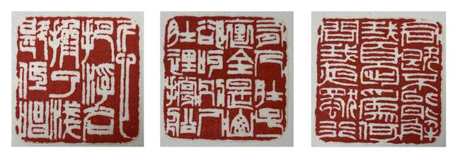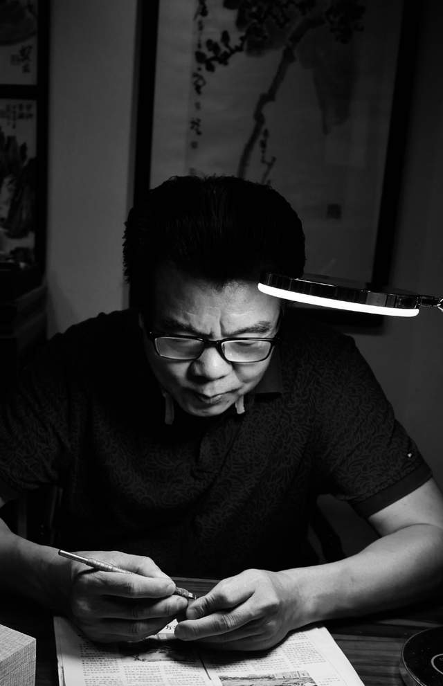 三 2001年8月,周老驾鹤西去。陈金光像家人一样,参与料理后事。周老的儿子、师兄周悌对陈金光说,你水平还可以,有责任去传承延续老人家的艺术。陈金光说:哥一句话,我责无旁贷。 在央企上班的陈金光工程师,辞职下海。没有任何仪式,开了耕石寮的门,开始了在藏天园的“卖艺”生涯。但开门第一天,打了个“空军”。 好在陈金光享受雕刻的快乐,他称之为DIY的快乐,不受约束的快乐,是文字语言转化为篆刻语言的成就感。 陈金光评价自己的作品,今天看不出比昨天好,但今年可以看出比去年好。这种进步不是处心积虑的刻意为之,而是蚕吃桑吐丝、牛吃草挤奶的厚积薄发。